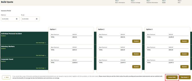 If you wish, you can upload a proposal Form at the 'Build Quote' stage via the ‘Contact DUAL’ button.